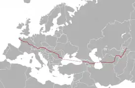 Орлеан Базель Цюрих Вена Будапешт Бухарест Констанца Тбилиси Баку Туркменбаши Ашхабад Бухара Термез Душанбе Иркештам Кашгар |