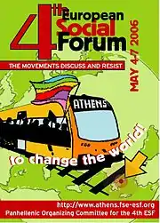 Третий социальный форум прошел в Лондоне в октябре 2004 года и собрал 25 000 человек из 70 стран[8]. Важную роль в его работе принимала Социалистическая рабочая партия. Четвертый соцфорум прошел уже почти через 2 года — в мае 2006 в Афинах. В его ходе 7 мая была проведена демонстрация, в которой участвовали 80 тысяч человек; важную роль в организации форума играла Коалиция радикальных левых (СИРИЗА).