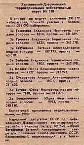 14 мая 1989 года с огромным отрывом, набрав в 19 раз больше голосов, чем ближайший кандидат, был избран народным депутатом СССР от Дзержинского территориального избирательного округа города Харькова и был им до конца существования СССР.