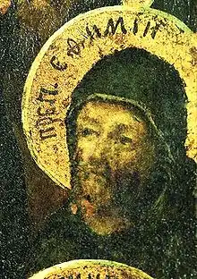 ![]() Икона работы иеромонаха Иринарха с учениками, мастерские Киево-Печерской лавры (1840-е годы). Находится у раки святого в Дальних пещерах | |