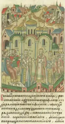 ![]() Посвящение в епископы Трифона Ростовского, Евфимия Суздальского, Давыда Рязанского, Геронтия Коломенского, Вассиана Сарайского | ||