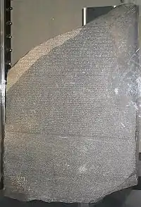 Европейские ученые в XVI—XVII веках, опираясь на неточные и неясные высказывания античных авторов, повторяли их ошибки и поэтому не смогли правильно подойти к делу дешифровки египетских надписей. В XVIII в. некоторые ученые, например де Гинь, Соэга и другие, правильно установили, что египетские иероглифы отчасти обозначали звуки и что в картушах (овальных рамках) содержались собственные, очевидно, царские имена. Далее Томас Юнг установил наличие фонетических знаков в египетской письменности, правильно определил значение ряда иероглифов и разобрал несколько имён. Однако честь окончательной дешифровки иероглифов принадлежит французскому ученому Франсуа Шампольону. Критически использовав достижения своих предшественников, Шампольон тщательно изучил многочисленные надписи, добытые во время наполеоновской экспедиции и изданные в «Описании Египта»; особенное внимание он обратил на Розеттскую двуязычную надпись, начертанную на греческом языке греческими буквами и на египетском — иероглифами и демотическими (наиболее скорописными) знаками. В 1822 г. Шампольон добился правильного прочтения ряда слов и имён в этой надписи, верно предположив, что египетские иероглифы обозначали не только целые слова, но также отдельные слоги и звуки. Шампольон сопоставил греческие имена Птолемей и другие, встречающиеся в греко-египетской Розеттской надписи, с соответствующими начертаниями этих имён в иероглифических надписях. Таким образом, Шампольону удалось установить, что некоторые египетские иероглифы имеют чисто звуковое значение, и, больше того, определить почти все знаки египетского алфавита. Однако Шампольон не остановился на этой первой стадии дешифровки. Упорно работая над изучением известных ему надписей, он сделал попытку составить грамматику и словарь египетского языка. Его научные труды дали сильный толчок развитию египтологии, главным образом в области изучения языка и письменности древних египтян.