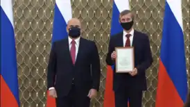![]() Вместе с Председателем Правительства Российской Федерации М. В. Мишустиным на вручении премий Правительства за 2021 год в области средств массовой информации (13 января 2022 года) | |