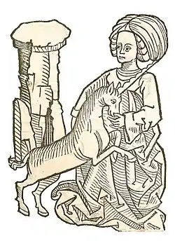 В сочинениях христианских писателей это легендарное существо упоминалось как символ Благовещения (см. Мистическая охота на единорога) и Боговоплощения. В средние века единорог выступал эмблемой Девы Марии, а также святых Юстина Антиохийского и Иустины Падуанской[6]. Рог единорога воплощал силу и единство Отца и Сына, а небольшие размеры животного символизировали смирение Христа.