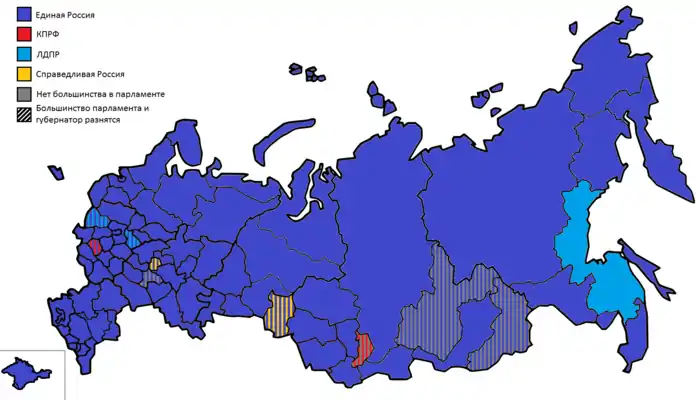 Карта партийной принадлежности губернаторов и партий с большинством в региональных парламентах после выборов в сентябре 2020 года.