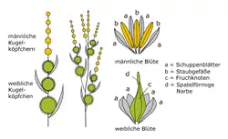 Цветки мелкие в плотных головках, собраны в общее соцветие — шаровидный початок — на верхушке стебля или его ветвей. Каждый из початков состоит из только тычиночных или только пестичных цветков; первые расположены на стебле выше вторых. Мужской цветок состоит из 3—6 невзрачных буроватых листочков околоцветника и длинных белых свободных тычинок с пыльниками, придающих соцветиям вид пуховок. Женский цветок состоит из трёх околоцветных чешуек и пестика с рыльцем 1,2—2 мм длиной. Мужских соцветий 3—8, расставленных женских 2—6. Женские соцветия зацветают раньше мужских на несколько дней (в это время пыльники в мужских цветках на том же растении ещё плотно сомкнуты), благодаря этому обеспечивается перекрёстное опыление растений.
