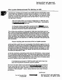В 2004 года, в ходе работы Комиссии 9/11, которая была создана для анализа терактов 11 сентября 2001 года, после заслушивания показаний тогдашнего советника по национальной безопасности Кондолизы Райс 8 апреля 2004, Комиссия призвала рассекретить PDB от 6 августа 2001 года, озаглавленное «Бин Ладен намерен атаковать США» (англ. Bin Ladin Determined To Strike in US). Два дня спустя, Белый дом опубликовал этот документ с минимальными редакционными правками.