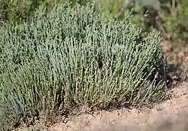 Полукустарничек высотой 5—25 см, внизу с деревянистыми, сильно разветвлёнными веточками, выпускающими многочисленные, светло- или сизо-зелёные или резко сизые, цилиндрические, диаметром у основания 1—2 мм, голые, однолетние побеги, состоящие, большей частью, из 5—12 то удлиненных (до 40 мм), то сильно укороченных (до 2—3 мм) междоузлий.
