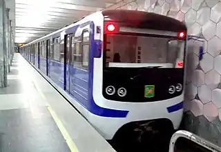 ![]() Электропоезд 81-710.1 на станции Дворец Спорта Харьковского метрополитена | |