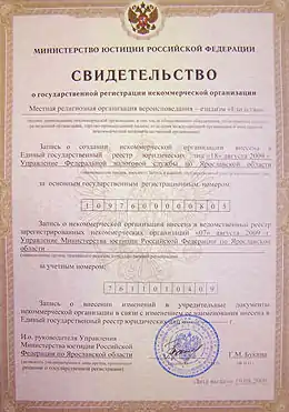 2 февраля 2009 года организация провела учредительное собрание[10] и приняла Устав,[11] а 9 февраля подала в Управление Минюста РФ по Ярославской области документы на регистрацию.[12] Однако, по-прежнему испытывая определённые сомнения, последнее приняло 10 марта решение о продлении срока рассмотрения документов для проведения государственной религиоведческой экспертизы.[13]