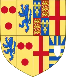 Щит разделён надвое. Справа герб Уильяма Куртене, графа Девона: начетверо — в 1-й и 4-й частях в золотом поле три червлёных шара [дом Куртене], во 2-й и 3-й частях на золотом поле лазоревый, вооружённый червленью восстающий лев [дом де Ревьер]. Слева английский королевский герб Йорков: начетверо — в 1-й части королевский герб Англии (в 1-й и 4-й частях в лазоревом поле три золотых лилии, во 2-й и 3-й частях в червлёном поле три золотых вооружённых лазурью леопарда (идущих льва настороже), один над другим) во 2-й и 3-й частях в золотом поле прямой червлёный крест [дом де Бург]; в четвёртой части — в лазорево-золотом поле серебряный щиток; в верхней части щита по углам зеркальное скошенное деление на золото и лазурь, в центральной части — между лазоревыми столпами золотой столп [Мортимеры])[64].