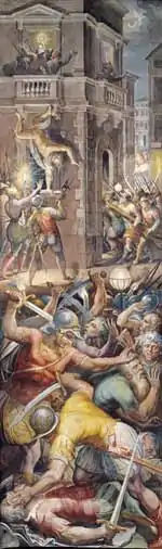 Гвардейцы короля ворвались в спальню Колиньи, убили его и выбросили тело из окна. Одновременно с этим прозвучавший колокол церкви явился условным знаком к началу убийств гугенотских лидеров, большинство из которых погибли в собственных кроватях[27]. Свежеиспечённый зять короля Генрих Наваррский был поставлен перед выбором между смертью, пожизненным заключением и переходом в католицизм. Он решил стать католиком, после чего ему предложили остаться в комнате для его же собственной безопасности. Все гугеноты внутри и вне Луврa были убиты, a те, кому удалось бежать на улицу, были застрелены ждавшими их королевскими стрелками. Парижская резня продолжалась почти неделю, распространившись по многим провинциям Франции, где беспорядочные убийства продолжились. По словам историка Жюля Мишле, «Варфоломеевская ночь была не ночью, а целым сезоном»[28]. Эта резня восхитила католическую Европу, Екатерина внешне наслаждалась похвалой, потому что предпочла, чтобы иностранные властители думали о сильной власти семейства Валуа. С этого времени ведёт своё начало «чёрная легенда» o Екатерине, злой итальянской королеве.