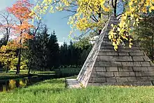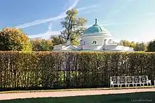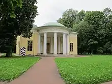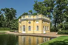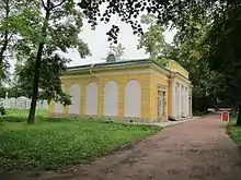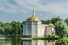 Павильон на острове Большого пруда, построенный в конце 1740-х годов по проекту С. И. Чевакинского и украшенный по эскизам Ф.-Б. Растрелли[16], был перестроен в 1794 году Д. Кваренги, а в 1817—1820 годах отремонтирован В. П. Стасовым. В XVIII веке павильон служил для музыкальных и танцевальных вечеров[17].