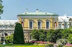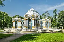 В царствование Елизаветы Петровны Царское село стало императорской резиденцией. В 1740—1750-е годы скромный дворец Екатерины I перестраивается в роскошную летнюю резиденцию. С 1744 года по замыслу архитектора А. В. Квасова старое петровское здание было переделано, надстроено и связано галереями с двухэтажными флигелями по бокам. Вскоре эту работу продолжил русский зодчий С. И. Чевакинский. Дворец состоял из трёх корпусов, церкви и оранжерейного зала, соединённых между собой галереями[7]. Через несколько лет и новый дворец показался недостаточно парадным и было решено его вновь переделать. С 1751 года по 1756 год реконструкцию Екатерининского дворца вёл архитектор Ф. Б. Растрелли. Работы велись круглый год, реконструкция потребовала огромных средств. Растрелли поднял галереи до уровня корпусов и с исключительным богатством и пышностью отделал фасады. В основных чертах дворец и сейчас имеет облик, который был придан ему Растрелли. В 1755 году из третьего Зимнего дворца сюда перенесли Янтарный кабинет. Параллельно с дворцом по проекту Растрелли в парке строятся павильоны «Эрмитаж», «Грот» и «Зал на острову» посредине Большого пруда для увеселительных собраний узкого круга придворных. Одновременно шло расширение территории сада, южной границей его стали Нижние пруды[2][8]. Для придания саду должного великолепия в него были перенесены статуи, а также широко практиковалась пересадка многолетних деревьев из петербургских садов. Наряду с этим в саду высаживались молодые деревья. Декоративные деревья и кустарники покупались и за границей. В 1751—1752 годах деревянные решетчатые заборы были заменены высокой каменной оградой с воротами по проекту Растерелли. В 1754—1757 годах близ дворца, на месте нынешней Гранитной террасы, по проектам А. К. Нартова и Растрелли было построено здание Катальной горки[6].