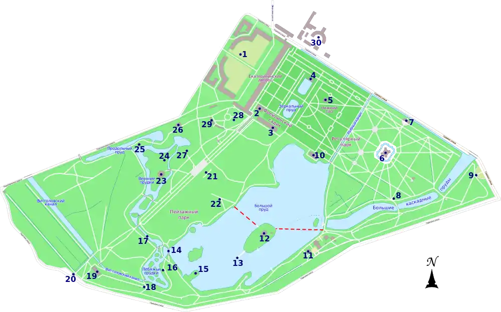 | 1. Екатерининский дворец | 11. Адмиралтейство | 21. Гранитная терраса |