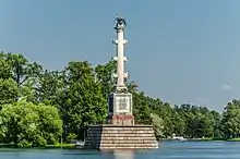 Чесменская колонна поставлена посреди Большого пруда в честь победы русского флота в 1770 году в Чесменском сражении над турецким флотом. Сооружена в 1771—1776 годах по проекту архитектора А. Ринальди и скульптора И. Г. Шварца. 22-метровая колонна из олонецкого розового мрамора стоит на четырёхгранном гранитном основании. Ствол колонны завершён аллегорической скульптурой: бронзовый орёл ломает турецкий полумесяц[2].