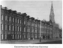 Елисаветинская богадельня была построена Елисеевыми в память безвременно умершей Елизаветы Григорьевны Елисеевой на Васильевском острове «для призрения престарелых и увечных в Санкт-Петербурге граждан».