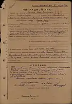 - Медаль «За победу над Германией в Великой Отечественной войне 1941—1945 гг.» (1945). Архивные документы о данном награждении из электронного банка документов «Подвиг Народа в Великой Отечественной войне 1941—1945 гг.»