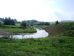 В городе река образовала глубокий овраг с крутыми склонами-берегами, на которых выступает известняк.