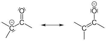 Енолят-ионы часто генерируют из соответствующих карбонильных соединений при низких температурах. Чаще всего для этого применяют ЛДА или гексаметилдисилазиды щелочных металлов или алкиллитиевые соединения при −78 °C. Енолят-ионы стабилизированы за счёт мезомерии (см. Теория химического строения) и являются амбидентантными нуклеофилами:
