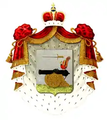 В щите, имеющем серебряное поле, изображен в верху Меч остриём в правую сторону обращённый; а внизу чёрная пушка на золотом лафете, стоящая на траве и на Пушке Райская птица.
