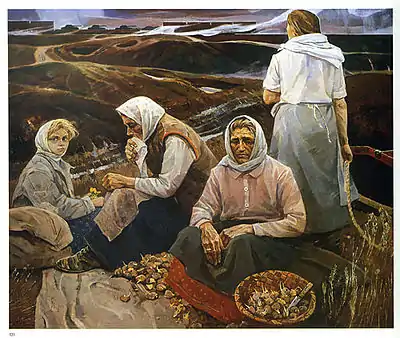 «Я пишу холсты обычно про своё, наболевшее. Много лет уже чувствовал: про мать написать должен. Моя мать была суровая, но справедливая. На ласку скупая. Она малышню беспомощную очень жалела, а подрастал — строго требовала. Не гладила меня по головке. В детстве и обиды бывали, а повзрослев, я понял, что правильно она меня воспитывала. Сама стройная, высокая, кисти рук длинные, красивые, рабочие. Её руки для меня много значили. Как совесть.