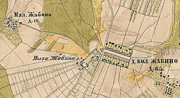ЖАБИНО МАЛОЕ — деревня барона Роппа, по просёлочной дороге, число дворов — 10, число душ — 30 м. п.(1856 год)[15]