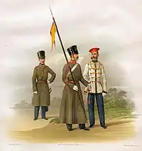 Обер-офицер и рядовые Лейб-Гвардии Гусарского Его Величества полка (1856 — 1857 годов), виден эскадронный значок.