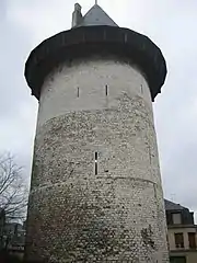 Слева: Башня в Руане, где Жанну допросили 9 мая 1431 года. Справа: Поль Деларош «Допрос Жанны кардиналом Винчестера» (1824) | ||