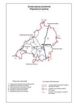 В Жарковский район, с точки зрения административно-территориального устройства области, входят 4 поселения[24][25].
