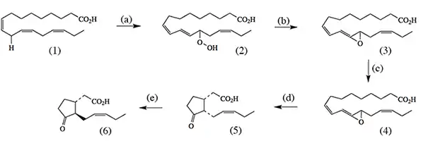 Биосинтез жасмоновой кислоты в растениях осуществляется из α-линоленовой кислоты.
