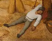 Наиболее интересны изображённые на переднем плане фигуры крестьян-жнецов. Некоторые из них продолжают работу, а другие едят и отдыхают у дерева. Один работник утомился и спит, раскинув руки и ноги. Его поза напоминает лежащего человека в другой известной картине Брейгеля — «Страна лентяев»[3].