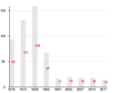 | 1879 | 1910 | 1928 | 1965 | 1997 | 2002 | 2007[15] |