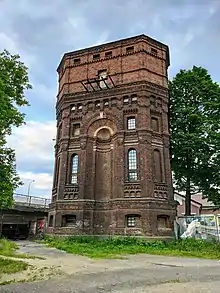 Вспомогательные корпуса отделаны лаконично, имеют 1-2 этажа. Водонапорная башня имеет три яруса и восьмигранную форму. Первый ярус низкий, широкий второй ярус украшают арочные ниши, стены третьего яруса глухие. В декоре использованы ниши, пилястры, орнаментальные пояса. Отдельные детали стилизованы под облик средневековых башен, например машикули и окна-бойницы[1].