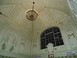 Высокий потолок главного зала вокзала, представляющий собой внутреннюю поверхность купола, а также стены его покрыты художественной лепкой в виде геометризованного орнамента из листьев, цветов, между которых помещены женские головки и маски. Волшебное сочетание светло-зелёного и белого цвета стен и лепки подчеркивают акценты позолоты. Интерьер украшают также растительные фрагменты, маскароны со стилизованными крылышками, кадуцеи и колеса — символы древнегреческого бога Гермеса, покровителя путников[9].