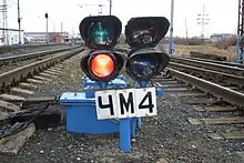 Маневровый светофор с включённым запрещающим маневровое движение синим сигналом
