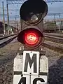 Маневровый светофор с включённым запрещающим маневровое движение красным сигналом