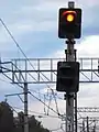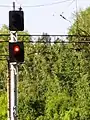 - Жёлтый мигающий — разрешается движение с установленной скоростью, следующий светофор открыт и сигнализирует об отклонении по стрелочному переводу (но требует проследования с уменьшенной скоростью).