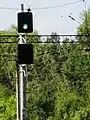 - Два жёлтых (ЖЖ) — разрешается движение с уменьшенной скоростью с отклонением по стрелочному переводу, следующий светофор закрыт (красный).