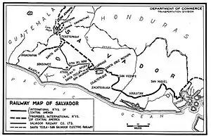 В начале 1950х годов в стране действовали две железнодорожные линии: Метапан — Сан-Сальвадор — порт Ла-Уньон общей протяженностью 460 км (находившаяся в собственности компании "International Railways of Central America" из США), а также линия длиной 150 км, связывавшая города Акахутла, Сан-Сальвадор и Санта-Ана (находившаяся в собственности компании "The Salvador Railway Company Limited")[4]. Небольшая часть второстепенных железнодорожных линий в это время находилась в собственности британских компаний[6].