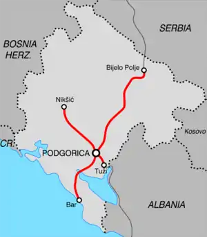 Основная линия идёт из Белграда (Сербия), через Биело-Поле и Подгорицу, в Бар (линия Белград — Бар). По этой линии осуществляется регулярное пассажирское сообщение. Действуют также грузовые ветки Подгорица — Никшич (пассажирское движение прекращено в 1992 году и по состоянию на 2013 год восстановлено) и Подгорица — Шкодер (Албания).
