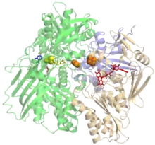 Железо-серный белок - металлопротеин, содержащий комплексы железа с неорганическими остатками серы и/или цистеина. Эти так называемые железосерные кластеры обычно являются активными центрами ферментов и играют важную роль в переносе электронов (обычно при низких уровнях окислительно-восстановительного потенциала).