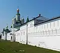 Монастырь окружён крепостными стенами с башнями.