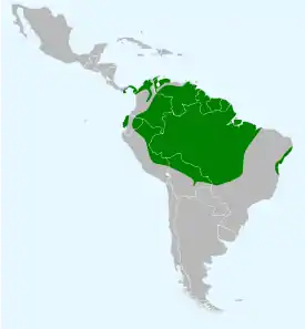 Вид населяет северную часть Южной Америки, территорию от Восточной Панамы и Венесуэлы до Бразилии, Перу и Боливии. Несколько популяций имеются также на карибском острове Тринидад.