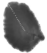 Слева на право: Желтопёрая камбала северных Курильских островов. Слепая и глазная стороны. Продольный шлиф отолита желтопёрой камбалы, возрастом 19 лет | ||||||||||