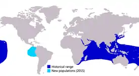 Желтопёрые каранксы широко распространены в тропических и субтропических водах Индо-Тихоокеанской области. Индийский океан: от Красного моря и Персидского залива вдоль восточного побережья Африки до ЮАР; вдоль азиатского континента, включая Пакистан, Индию, юго-восточную Азию, Индонезию и северную и западную Австралию; а также у островов в Индийском океане, включая Мальдивские, Сейшельские, Кокосовые острова, Мадагаскар и множество мелких островов. Тихий океан: от юга Японии и Гонконга до Вьетнама, Восточной Австралии и Новой Зеландии; у островов Тонга, Питкэрн, Гавайские острова и до Галапагосских островов[13][14].