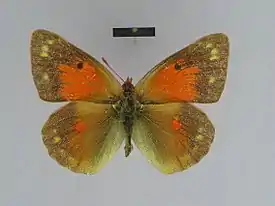 Передние крылья самцов на нижней стороне двуцветные: внешнее поле окрашено в зеленовато-желтые цвета с субмаргинальным рядом треугольных черных пятен. Центральная область крыла оранжево-жёлтая, у заднего края беловато-жёлтая. Заднее крыло на нижней стороне зеленовато-желтое, с черноватым опылением, бахромка у переднего угла беловатая, вблизи заднего — розовая.