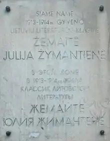 Мемориальная доска на доме в Вильнюсе, в котором писательница жила в 1913—1914 годах (улица Басанавичяус 19)