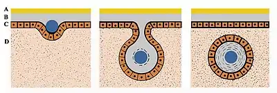 А — наружный слой раковины моллюска, В — слой перламутра, С — внешний эпителиальный слой мантии моллюска, D — мантия моллюска. Синим цветом обозначено инородное тело.