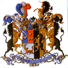 Щит полупересечён и рассечён. Первая часть рассечена и содержит в правом, лазоревом поле выходящую из серебряного облака с правой стороны руку в серебряных латах, держащую серебряный изогнутый меч. В левом, червлёном поле, три золотых ядра (1 и 2). Во второй, серебряной части, червлёная лисица, обращённая вправо, держит во рту зелёную масличную ветвь. Третья (левая) часть рассечена на чёрное и золотое поля, в ней изображен скачущий единорог переменных с полями цветов, с червлёными глазами, рогом, языком и копытами (изм. польский герб Боньча).